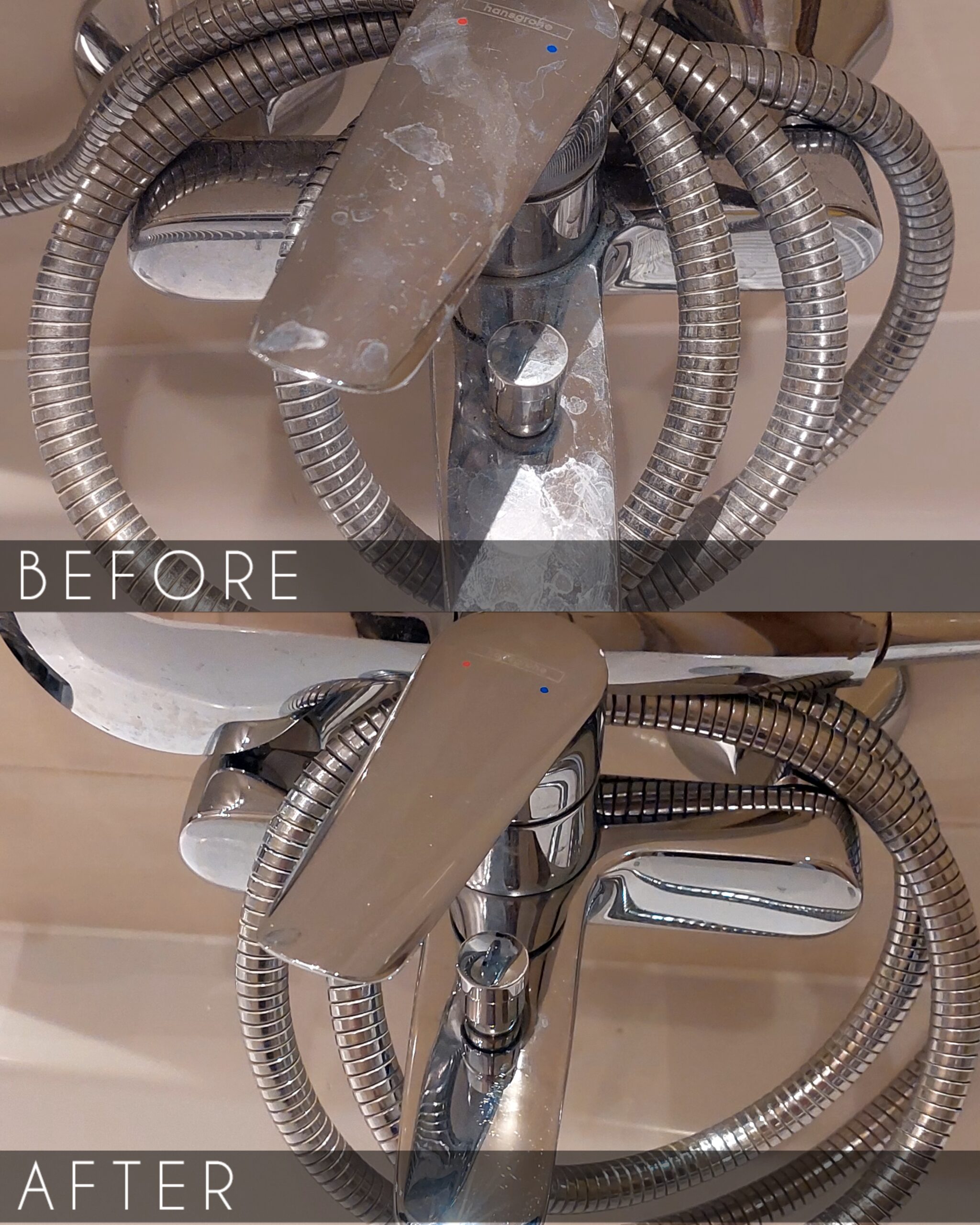 Tak wygląda armatura łazienkowa przed i po dokładnym czyszczeniu. Po usunięciu kamienia i zacieków baterie znów prezentują się czysto i schludnie