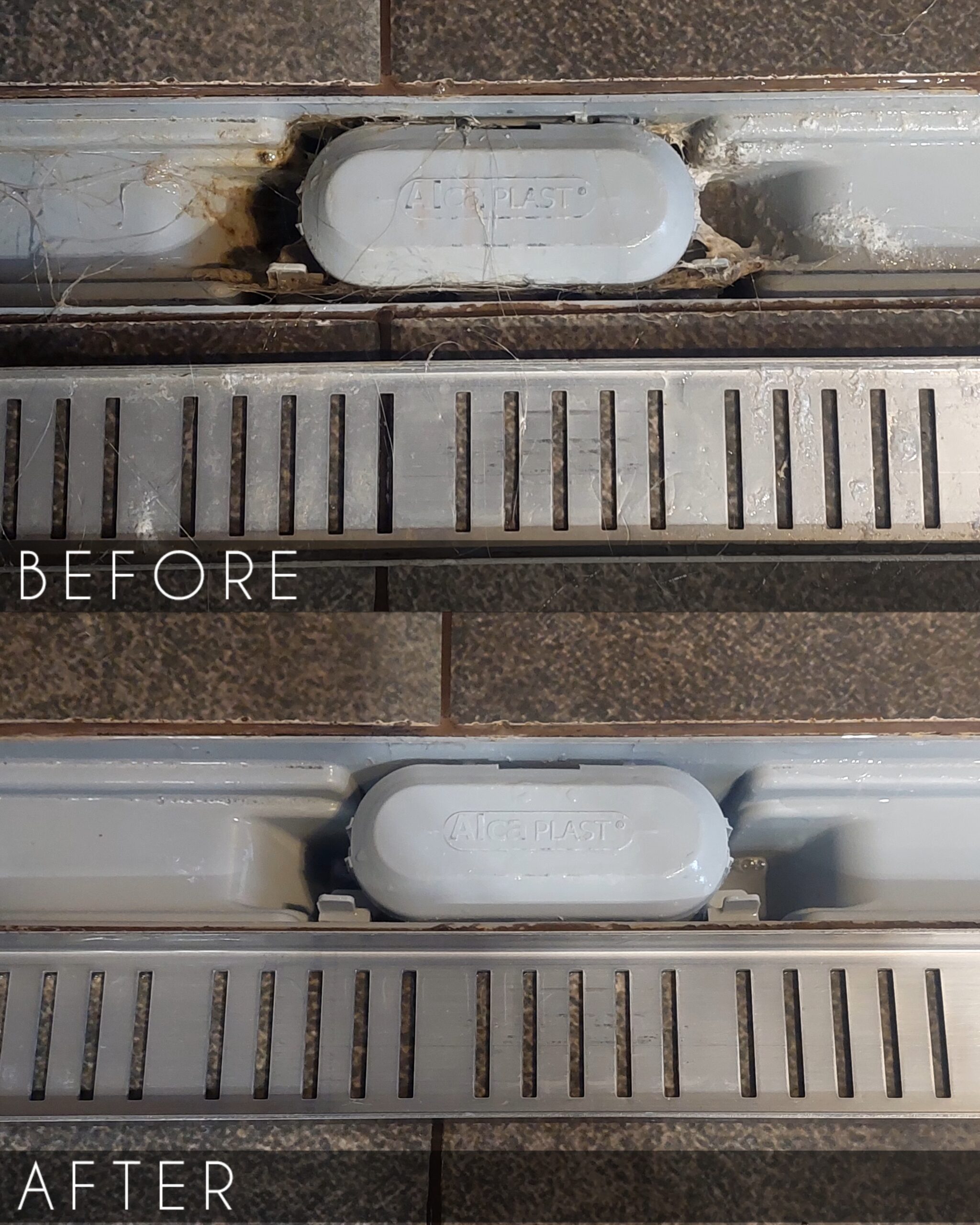 Usunięcie nagromadzonych osadów, włosów i zanieczyszczeń z odpływu liniowego. Dokładne oczyszczenie kratki i elementów wewnętrznych, poprawa drożności odpływu oraz estetyki strefy prysznica.